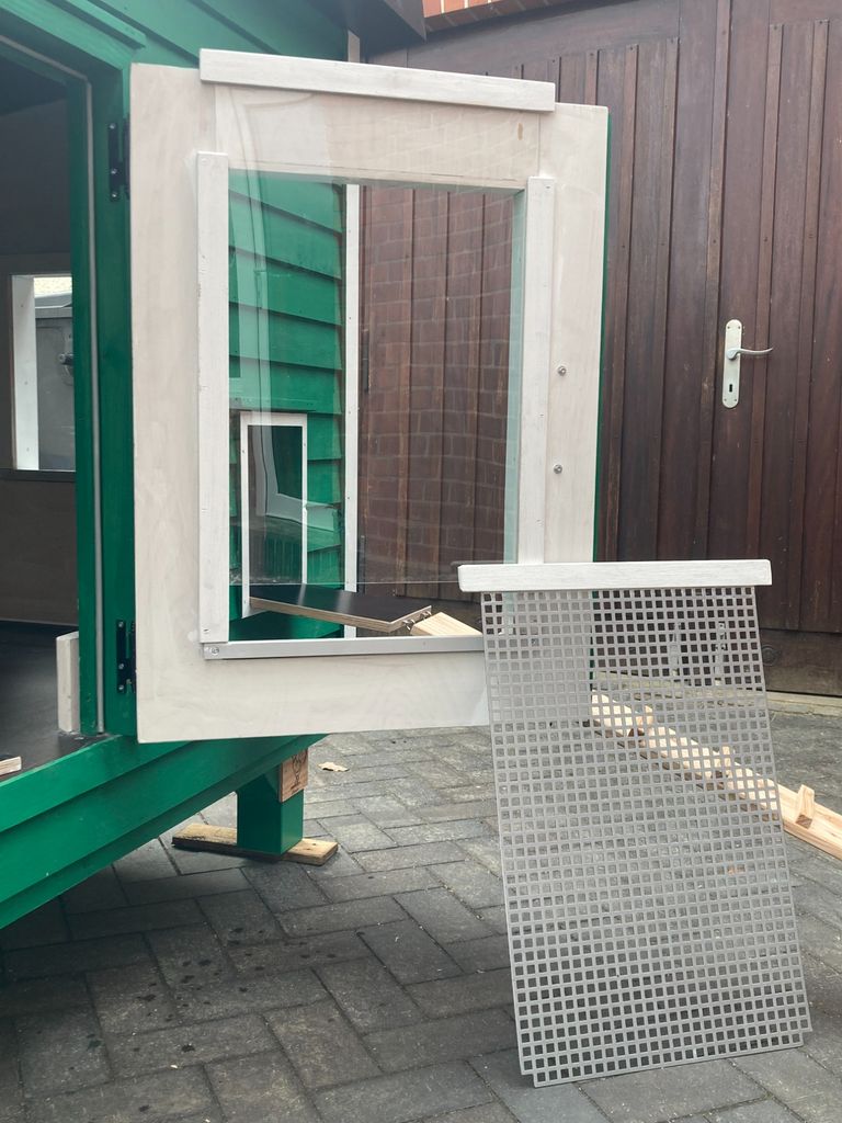 Wir verbauen Plexiglas-Fenster. Für mehr Luftzirkulation, speziell an heißen, trockenen Tagen, bieten wir dir Sommergitter (feste Metallgitter) an, die sich ganz einfach gegen die Plexiglasscheibe tauschen lassen.